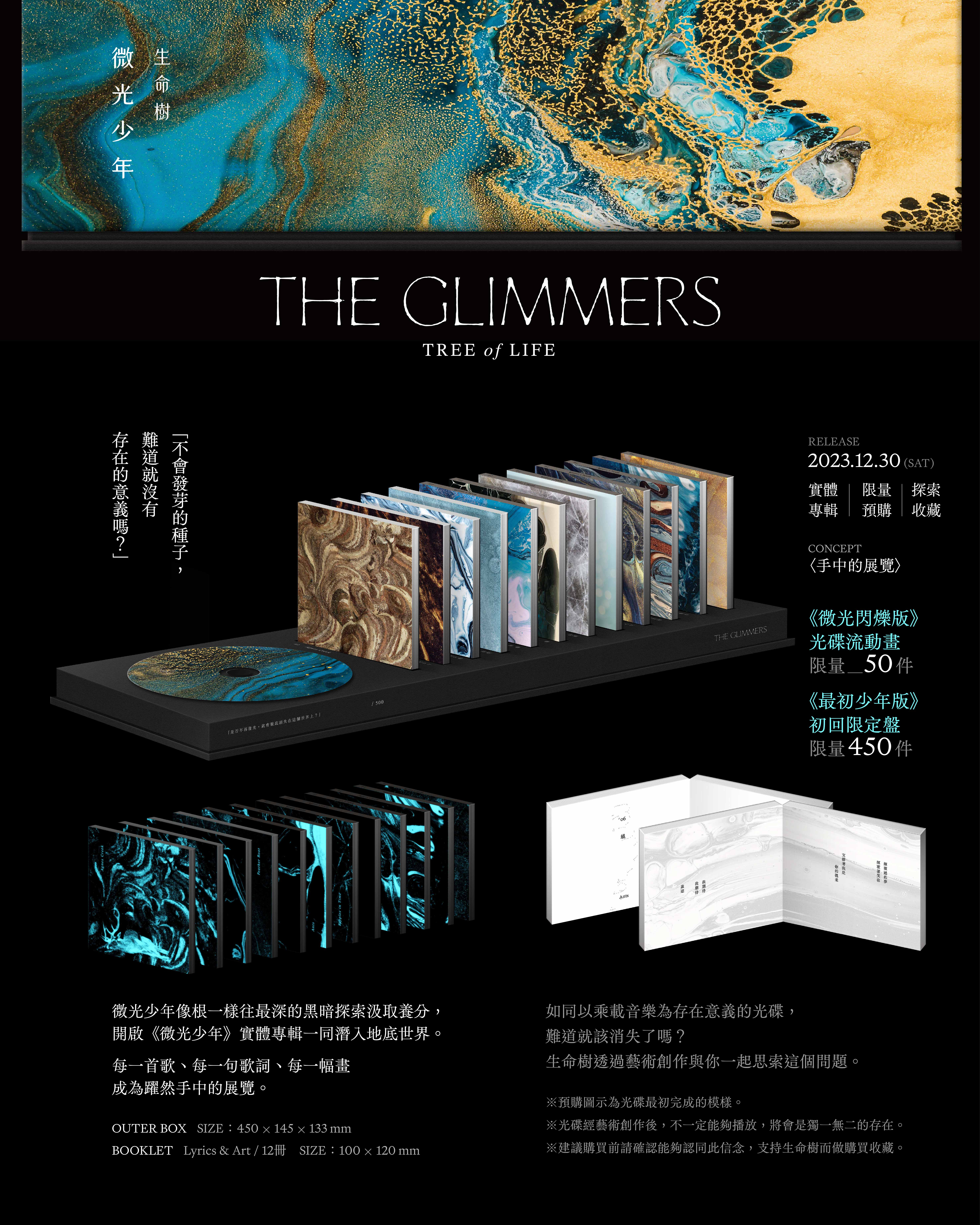 ⽣命樹《微光少年》Tree of Life《The Glimmers》RELEASE 2023.12.30.SAT實體專輯 / 限量預購 / 探索收藏《微光閃爍版》光碟流動畫 / 限量 50張 / 售價:1,500元(已完售)《最初少年版》初回限定盤 / 限量450張 / 售價:1,200元「是否不再發光,就會徹底消失在這個世界上?」*專輯限量製作僅 500張,限量編號依訂單完成順序寄出。*初回限定盤,將於全數製作完成後,依序釋出。*物流因專輯體積超出超商店到店的適用尺寸,採用宅配寄送。